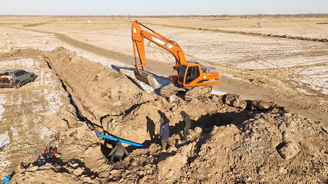 数九寒冬,通辽市科左中旗图布信苏木高标准农田建设现场同样热火朝天,多台大型挖掘机在广袤的黑土地上伸展长臂,有序进行挖掘作业,施工人员冒着严寒,在已开挖的沟渠中进行着管网铺设与焊接。“查干莫力嘎查今年落实高标准农田项目14000亩,建成高标准农田后,不仅实现了田成方、路成网,灌溉方便了,还能使用大型农机。”图布信苏木查干莫力嘎查党支部书记黄秋颖说。