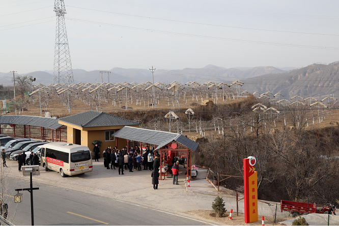 沿着村道向果园深处走去,连片的标准化苹果种植园映入眼帘。整齐划一的果树行距规整、树形优美,白色防雹网如银纱般覆盖枝头,地布与秸秆覆盖在树盘周围,软体集雨窖、水肥一体化设备错落分布。曾经零散粗放的坡地,如今变身“渠相通、路相连、旱能灌、涝能排”的高标准果园,成为黄土高原上一道亮眼的绿色风景线。