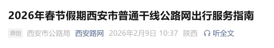 2026年春节假期(2月15日至23日),西安普通干线公路网日均交通流量预计达9074辆,同比增长4.6%。假期第八天(2月22日)车流量最大,假期第二天(2月16日)最小。