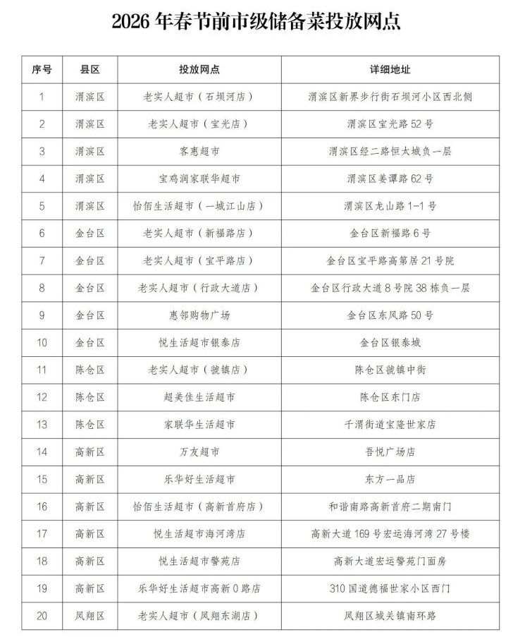 投放网点覆盖渭滨、金台、陈仓、高新、凤翔等主要城区,包括老实人超市、悦生活超市、怡佰生活超市等20个点位。各投放点将统一悬挂“宝鸡市市级储备菜投放点”标识,市民可凭购物凭证对价格、质量问题进行投诉反馈。(记者 张黎江)