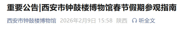 2月9日,西安市钟鼓楼博物馆发布2026年春节假期参观指南。为满足游客需求,2月17日至3月3日(正月初一至十五),博物馆每日开放时间延长至8:30-21:30(21:00停止售票)。