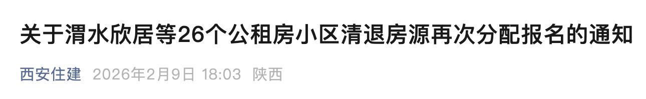 2月9日,西西新闻记者从西安市保障性住房管理中心获悉,西安市目前有清退房源的公租房小区共计26个,房源合计1496套,该中心委托市安居集团于近期对以上房源进行分配。