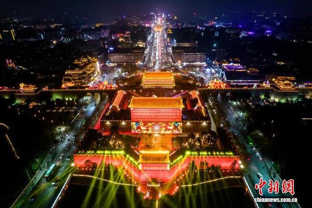 夜幕降临,西安城墙灯火璀璨,各式花灯次第绽放,与城门春联相映成趣,也让这千年城韵在新春佳节中焕发新生。