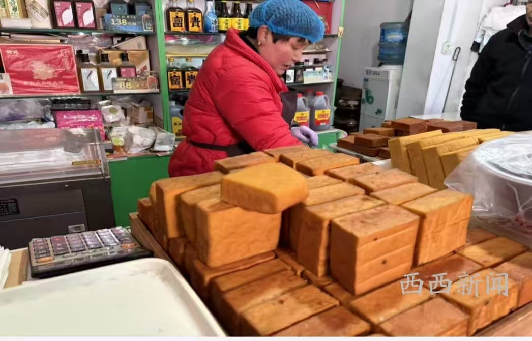 “这一辈子就做成了一件事,小姑娘的时候在卖豆腐,老了还在卖,之前央视也来拍过。”刘自惠笑着向记者介绍,黄官豆腐干始终选用本地优质黄豆,严格恪守浆水点卤的传统古法,历经浸、磨、滤、煮、点、压、熏七道核心工序,再以松枝慢火熏制,成品色泽微黄、口感筋道、豆香醇厚。这一口传承百年的老味道,不仅是当地群众过年必备的风味小吃,更是无数在外游子心中难以割舍的乡愁记忆。