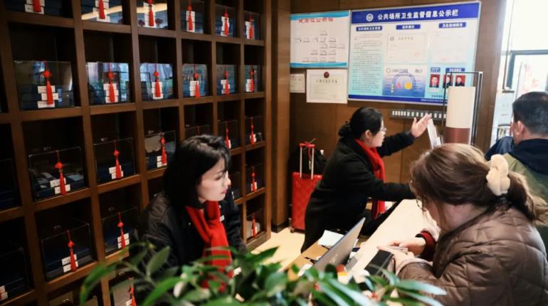 文渊阁酒店的工作人员坚守在岗,前台、房务、餐饮各司其职,以贴心服务为游客营造温馨舒适的旅居环境。