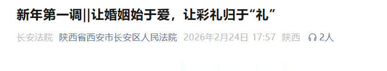 2月24日,新春伊始,西安市长安区人民法院调解一起因“闪婚”引发的离婚纠纷,解决了双方围绕20余万元彩礼产生的争议。