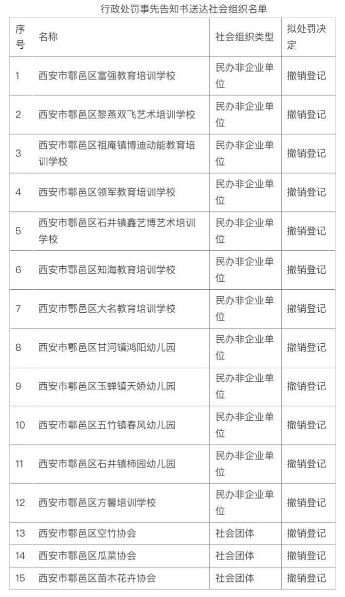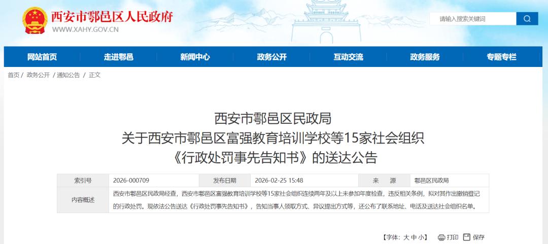 2月25日,西安市鄠邑区民政局发布关于西安市鄠邑区富强教育培训学校等15家社会组织《行政处罚事先告知书》的送达公告:
