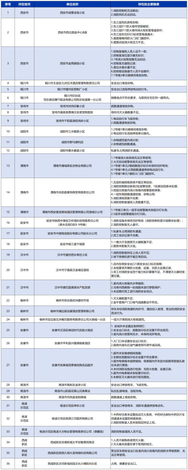 近日,陕西省消防部门持续开展火灾隐患排查整治行动,并于2月27日集中曝光了2月份检查发现的36家存在火灾隐患的单位,涉及全省多个地市,涵盖居民小区、酒店商超、企业场所等多种类型。