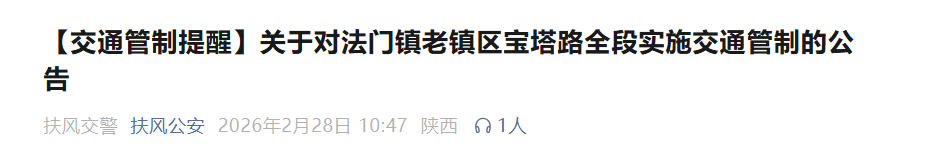 据宝鸡扶风县相关部门公告,该县县城新区及法门镇两处路段将先后实施交通管制,其中县城新区管制措施已自3月1日开始执行。