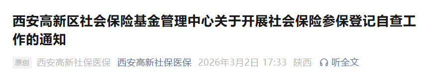 近日,西安高新区社会保险基金管理中心发布通知,针对区内经营性人力资源服务机构、劳务派遣机构及相关单位,启动社会保险参保登记专项自查工作。