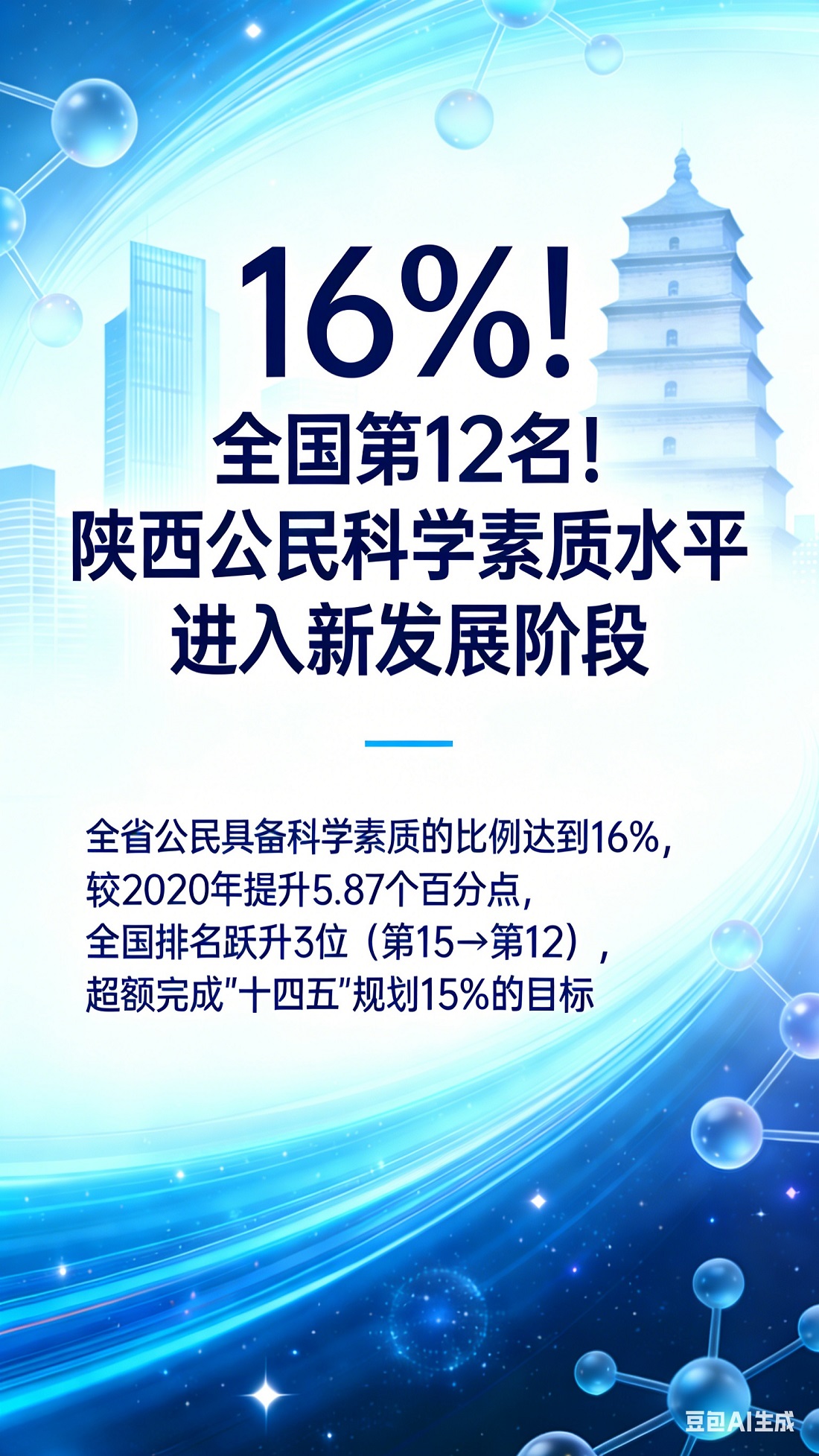 3月10日,据陕西省科协消息:由中国科协与国家统计局合作开展的第十五次中国公民科学素质抽样调查结果出炉,“十四五”末(2025年)陕西省公民具备科学素质的比例达到16%,较“十三五”末(2020年)的10.13%提高了5.87个百分点,在全国排名从第15名提升至第12名,超额完成《陕西省贯彻〈全民科学素质行动规划纲要(2021—2035年)〉实施方案》中“到2025年比例达到15%”的目标。