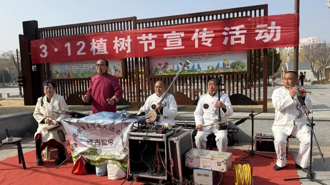活动现场,工作人员通过设立咨询台、摆放宣传展板、发放科普资料等形式,向过往市民普及植树造林、林草管护、病虫害防治等相关知识,解读义务植树政策及线上参与渠道。同时,邀请陕北说书艺人演绎原创曲目,以群众喜闻乐见的方式讲述榆林治沙故事与生态建设成效,让绿色理念深入人心。