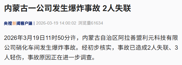 3月19日11时50分许,内蒙古自治区阿拉善盟利元科技有限公司硝化车间发生爆炸事故。经初步核实,事故已造成2人失联、3人轻伤,事故原因正在进一步调查。
