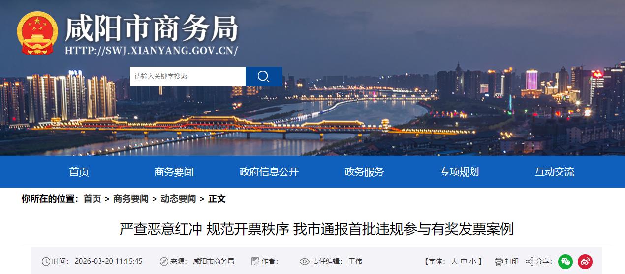 3月20日,咸阳市商务局、市财政局、市税务局联合发布通告,对2026年2月10日至2月28日有奖发票活动期间违规红冲发票的51名用户作出处理,暂停其参加有奖发票试点活动资格,涉事奖金全额退回。