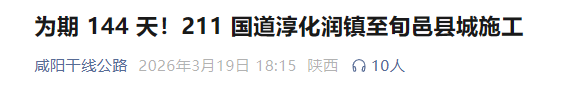 据了解,封闭施工路段为211国道旬邑县城甘坡村(K538+750)至淳化润镇(K593+143)段,封闭时间为2026年3月24日至8月4日,工期144天。施工期间,禁止所有车辆及行人通行。