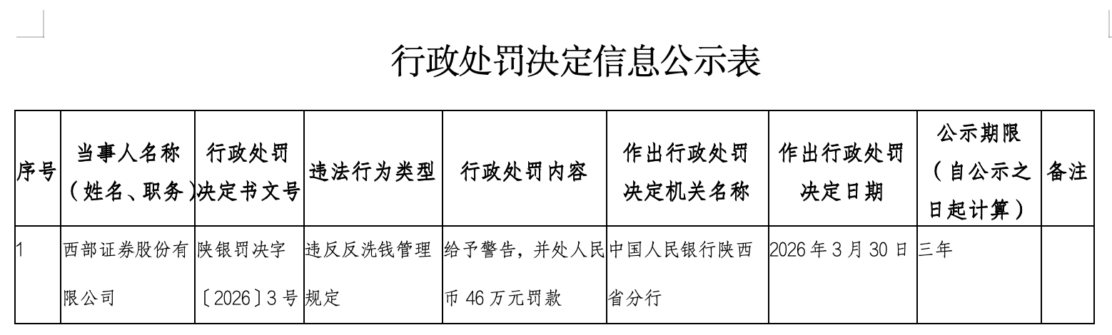 罚单显示,西部证券股份有限公司的主要违法违规事实(案由)为违反反洗钱管理规定。针对上述违法违规行为,中国人民银行陕西省分行对其警告并处46万元罚款。(记者 苏珊)
