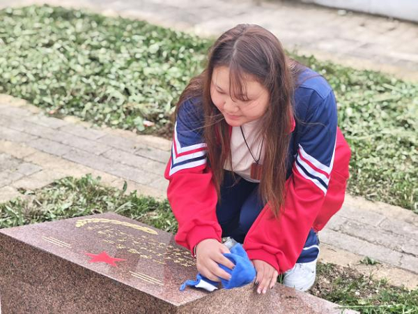祭扫尾声,同学们自发用毛巾擦拭墓碑、拔除杂草、清理走道,以实际行动守护英烈安息之地。细致的动作、专注的神情,彰显着青年学子对英烈的崇敬,也使文明祭扫理念深入人心。