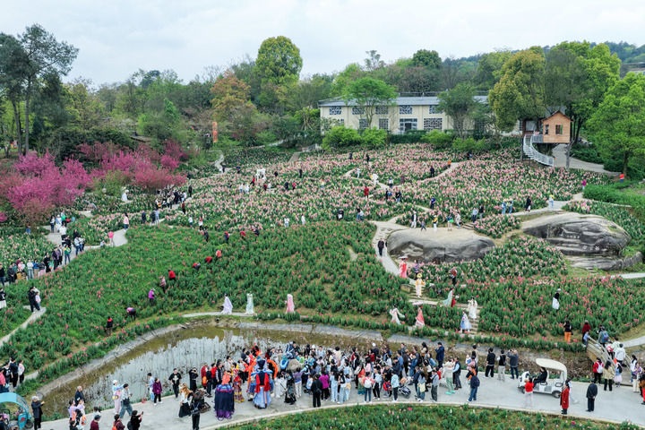 2026年3月22日,游客在重庆市巴南区二圣镇集体村云林天乡景区踏青游玩(无人机照片)。近年来,重庆市巴南区二圣镇集体村依托云林天乡景区,发展都市休闲观光农业,深入推进农文旅深度融合发展,通过打造油菜花、金鱼草等不同品种的四季高山花海主题景区,实现从过去苗木基地“卖苗木”到乡村旅游“卖景观”的转变,带动村民增收致富。新华社记者 黄伟 摄
