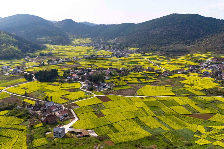 3月28日拍摄的汉中市南郑区阳春镇陈村的油菜花海(无人机照片)。新华社记者 邹竞一 摄