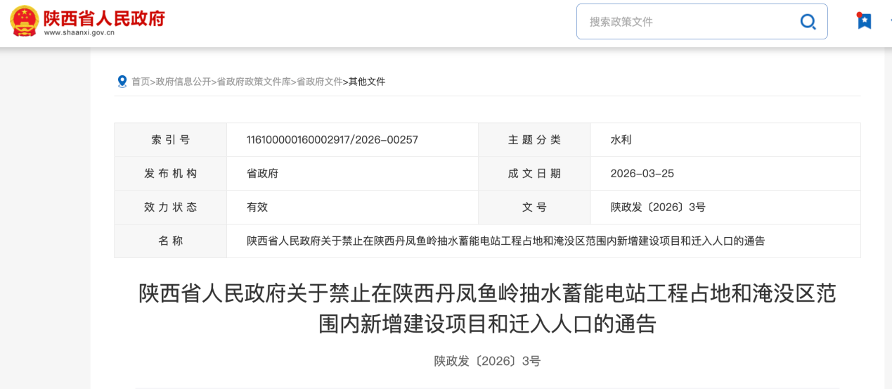 近日,陕西省人民政府发布消息称,为推进陕西丹凤鱼岭抽水蓄能电站工程顺利实施,禁止在陕西丹凤鱼岭抽水蓄能电站工程占地和淹没区范围内新增建设项目和迁入人口。