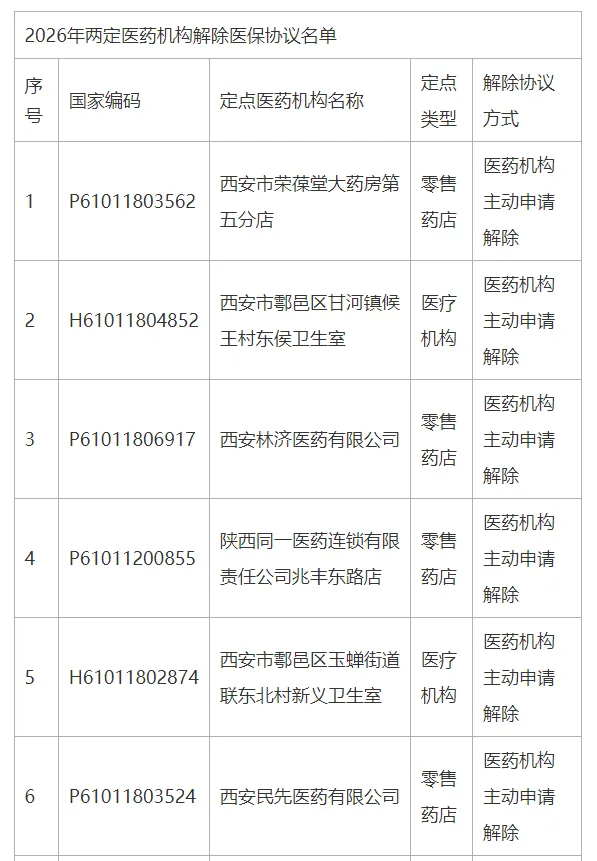 近日,西安市鄠邑区医疗保障局公布《关于2026年第一季度解除医保服务协议医药机构名单》。
