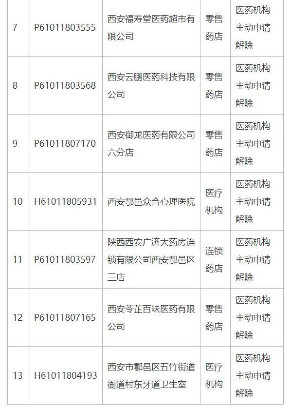 据悉,根据西安市医疗保障局《关于印发<西安市医疗机构医疗保障定点管理实施细则><西安市零售药店医疗机构保障定点管理实施细则>的通知》(市医保发〔2021〕118号)文件精神和要求,西安市荣葆堂大药房第五分店等13家定点医药机构主动申请解除医保服务协议。(记者 苏珊)