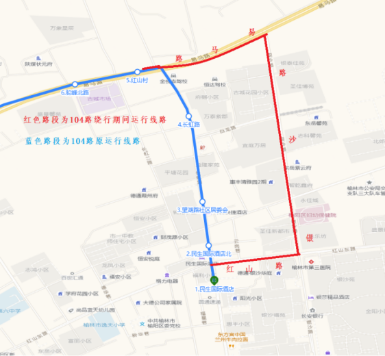 104路由民生国际酒店发车,原线行驶至红山路与长虹路十字右转,经红山路、银沙路、易马路后恢复原线运行。(上下行一致)
