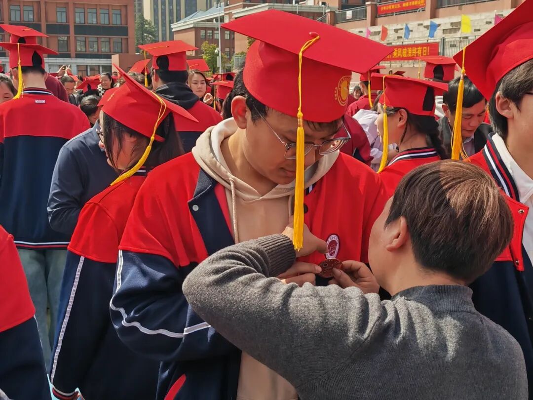 家长们亲手为孩子戴上成人帽,扣上成人徽章,披上励志飘带。少年们给父母以紧紧的拥抱,所有的感恩与爱意,都在这一瞬间尽数表达。