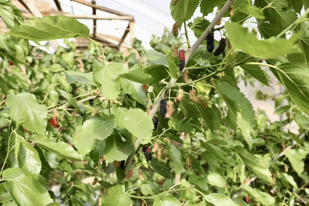 “今年的桑葚长势很好,第一茬果实已经开始采摘,第二茬约在中秋节之后成熟。农场现有2座桑葚种植大棚,一直坚持绿色、生态、无公害种植,使用酵素有机肥。两座大棚每年能带来约12万元的收益。”马艳美家庭农场负责人杨营说。