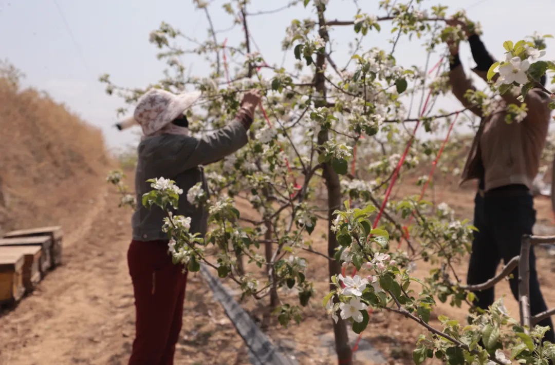 “当前正是山地苹果开花授粉的关键时期,除了用无人机喷施花粉外,还采购了4箱4万余只蜜蜂辅助授粉,双管齐下,今年果树座果率预计能提升25%左右!”4月14日,在榆林市子洲县裴家湾镇寺家沟村的山地苹果种植基地,漫山遍野的粉白苹果花迎风盛放,基地负责人乔玉俊一边指着穿梭在花海中的植保无人机,一边介绍着今年的花期管护新举措。不远处的果园里,十余名工人正有条不紊地开展拉枝作业,通过优化树体通风透光条件,为后续果实膨大、提质增产打下坚实基础。