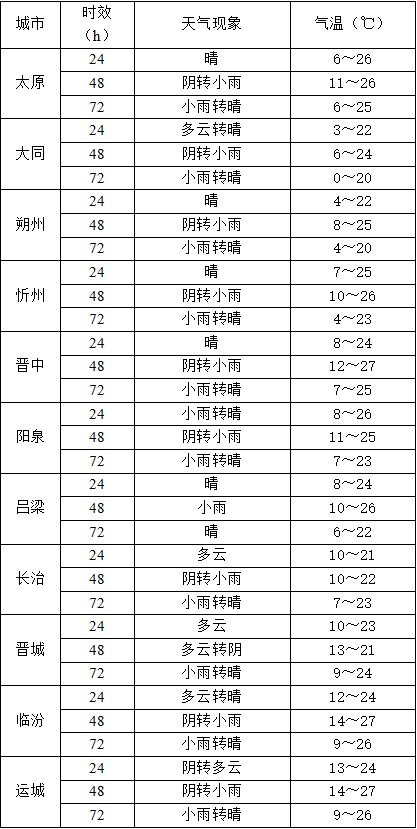 4月15日,全省多云转阴天,有阵雨或小雨,大同、朔州、忻州、吕梁、临汾等地的局部地区有中雨;全省大部分地区有4级左右,短时5-6级偏南风。最高气温:全省24~28℃。最低气温:北部及中南部山区4~11℃,中南部其余地区11~15℃。