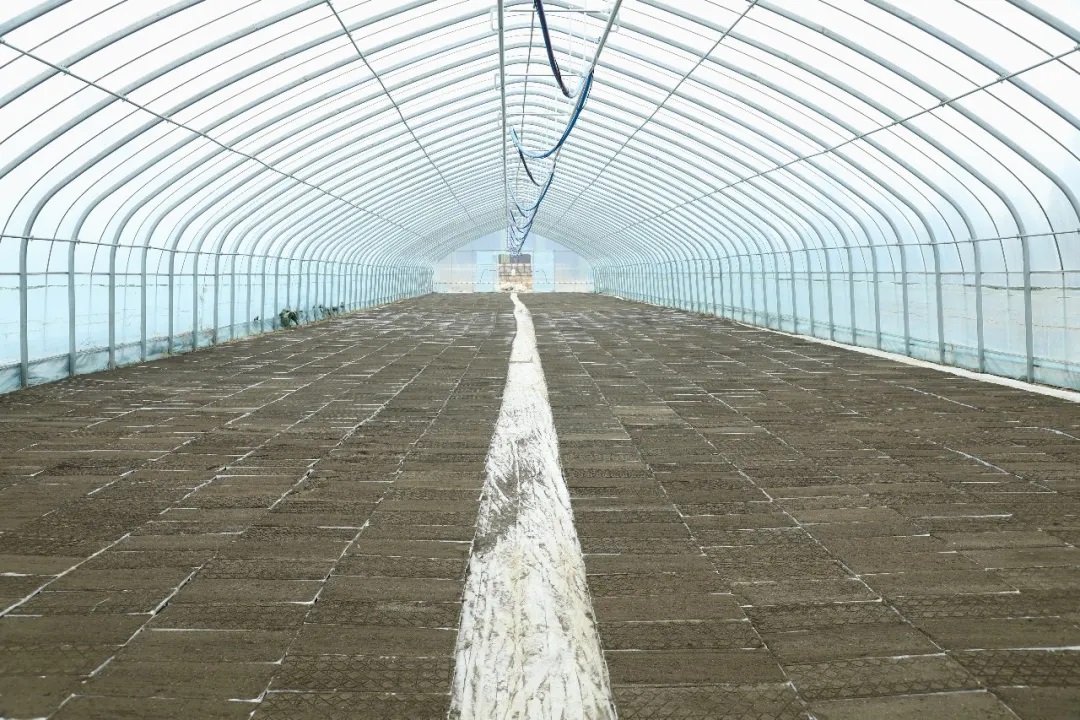 大棚内整齐摆放的培育盘