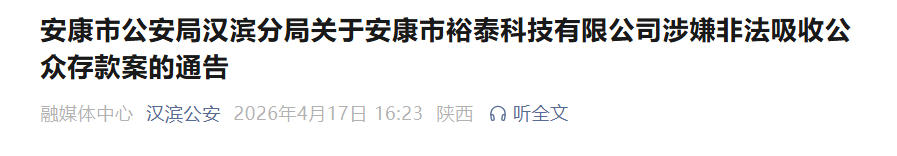4月17日,安康市公安局汉滨分局正式发布通告,敦促“安康市裕泰科技有限公司涉嫌非法吸收公众存款案”相关行为人、协助人主动投案退缴获取的涉案资金,并呼吁未报案的集资参与人限期完成登记。