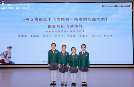 在西京学院副校长黄文准、陕西人民教育出版社总编辑叶峰为新书发布揭幕之后,来自西安市高新第四小学青鸟教室的曹镱馨、王浩宸、冯兆禾、李依诺、马昱抒、王沿丁、王钟洁、代沁予同学,分别用汉语和英语深情诵读了绘本中埃德加·斯诺与乔治·海德姆在郑州会合之后经西安艰难到达陕北根据地采访的精彩片段。