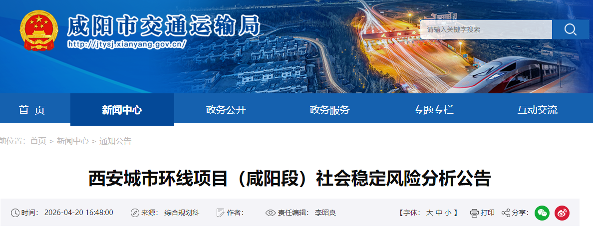 咸阳市交通运输局 4 月 20 日发布信息,西安城市环线项目(咸阳段)计划 2027 年开工,2030 年建成,总工期 36 个月。该项目是西安城市环线西段的核心组成部分。