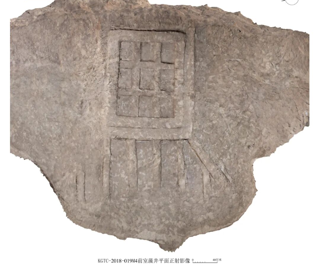 专家介绍,该墓最重要的收获在于在墓葬前室盝顶部的土雕,图案为仿木屋顶建筑结构,盝顶中央雕刻长方形平綦方框,长2米、宽1.6米,方框内雕九个方格藻井,呈长方形。