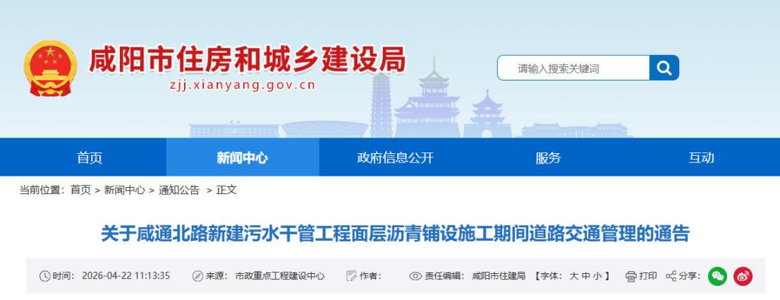 4月22日,咸阳市住房和城乡建设局、咸阳市公安局交通管理支队联合发布通告,4月25日至30日将对咸通北路(文林西路—玉泉路段)进行路面沥青铺设施工,工期6天。施工期间,该路段西半幅由北向南方向机动车道将实施封闭。