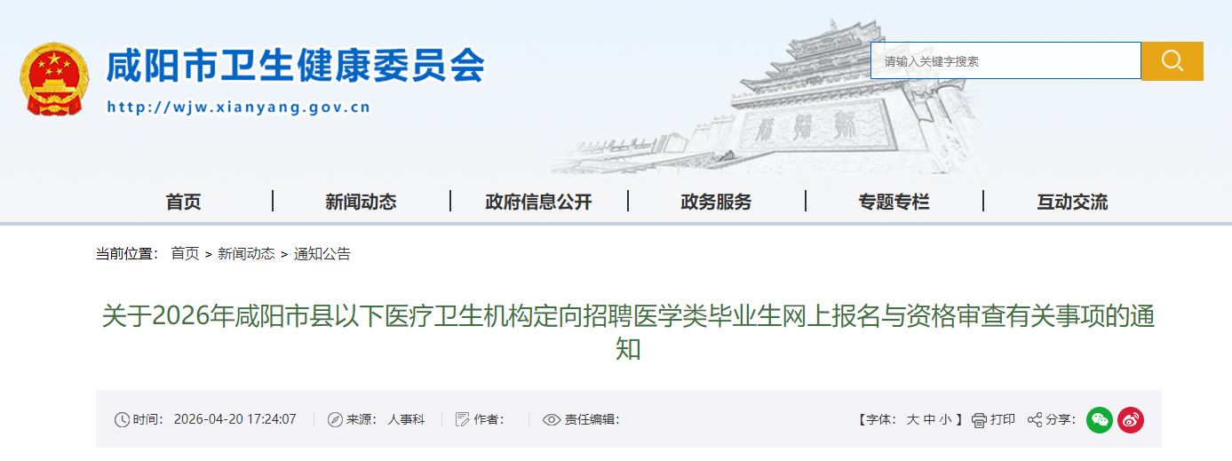 4月16日,陕西省人社厅、省卫健委联合发布公告,2026年面向全省定向招聘607名医学类毕业生到县以下医疗卫生机构工作。4月20日,咸阳市卫健委、市人社局发布本地安排,咸阳计划招聘62人,统一执行省级报名、考试及待遇政策。