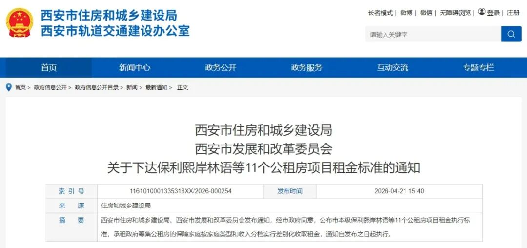 根据《西安市公共租赁住房管理办法》(市建发〔2025〕104号)等相关规定,经市政府同意,现将市本级保利熙岸林语等11个公租房项目租金执行标准通知如下: