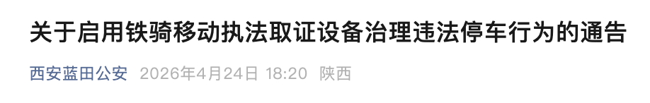 近日,西安市蓝田县公安局交通警察大队发布消息称,为进一步规范全县城区及辖区道路停车秩序,有效治理机动车违法停车乱象,提升道路通行效率,保障群众出行安全、畅通、有序,蓝田县公安局交通警察大队决定,正式启用铁骑移动执法取证设备,对辖区内机动车违法停车行为开展全天候、全覆盖移动执法取证。