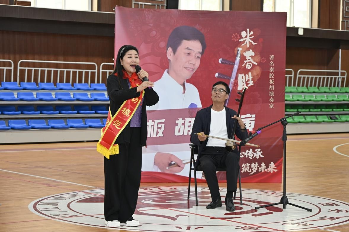 西安市劳动模范,西安三意社有限公司党支部书记、执行董事兼总经理侯红琴现场授课。侯红琴不仅讲授了秦腔的基本知识,也展示了高亢激越的唱腔和细腻传神的表演,赢得了师生们阵阵喝彩。