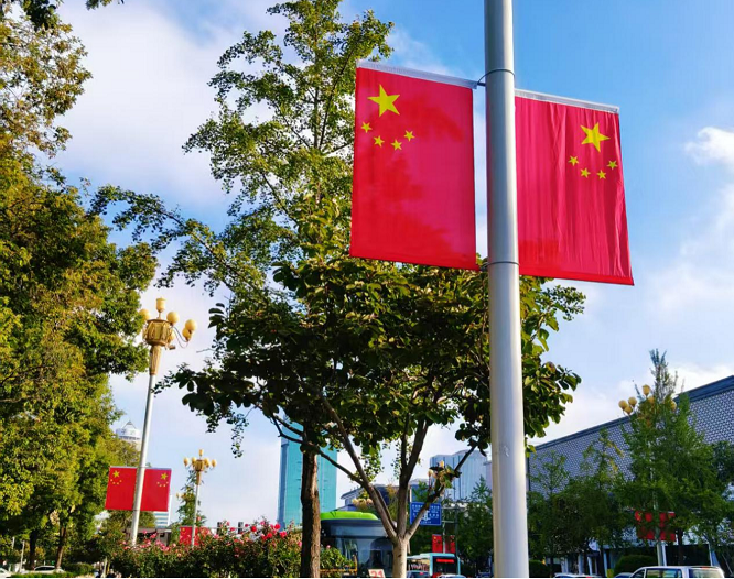 随着国庆佳节临近,汉中市主要街道纷纷换上“节日装”。天汉大道作为城市主干道,每根灯杆上悬挂着两面五星红旗,在秋日阳光下熠熠生辉。