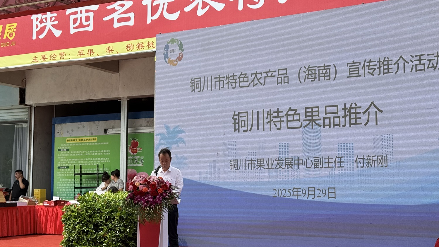 9月29-30日,铜川市特色农产品(海南)宣传推介活动在海口市举办。活动通过宣传片播放、农产品展示、品牌推介及合作签约等多元化形式,搭建起铜川与海南农业合作的桥梁。铜川市农业农村局、海口市农业农村局及海南陕西商会负责同志分别在致辞中提到,本次活动以铜川资源与海南特色互融为基调,是后续深入合作发展的良好基础。铜川市果业发展中心副主任付新刚为与会嘉宾及现场观众做了铜川优质果品的介绍、推介。