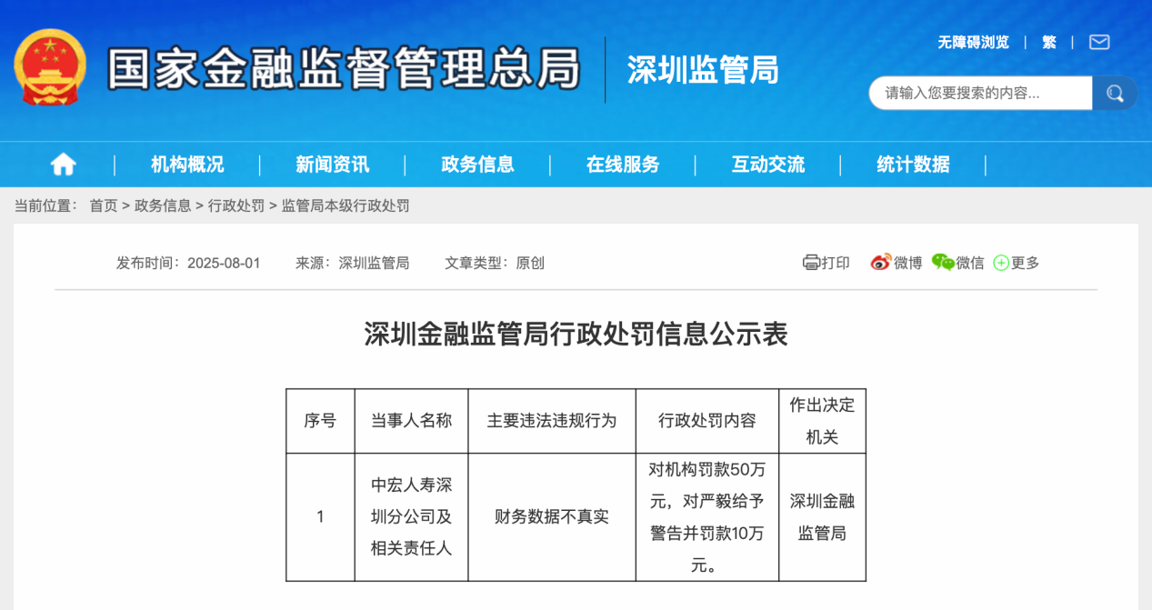 8月1日,国家金融监督管理总局深圳监管局发布行政处罚信息公示表,因财务数据不真实,中宏人寿深圳分公司被罚款50万元,责任人严毅被给予警告并罚款10万元。