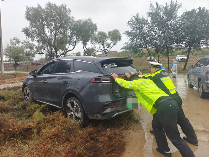 一次、两次……持续发力推行十多米后,车辆终于被推至安全路段。临行前,他们不忘叮嘱车主:“雨天路滑,慢慢开,注意安全!”这样的雨中援手,对于靖边公安交警来说,已是假期坚守里的“标配动作”。