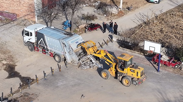 在印台区广阳镇水利村的废旧农膜回收点一派忙碌景象。机械轰鸣声中,经过压实、规整的膜捆被逐一装载上车,即将送往专业机构进行资源化处置。