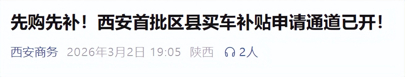 西西新闻记者获悉,2026年西安市首批区县汽车购置补贴活动已于近日启动,新能源车与燃油车均可享受相应补贴。目前补贴申请通道已正式开启,实行“总量控制、先购先补、补完即止”的原则。