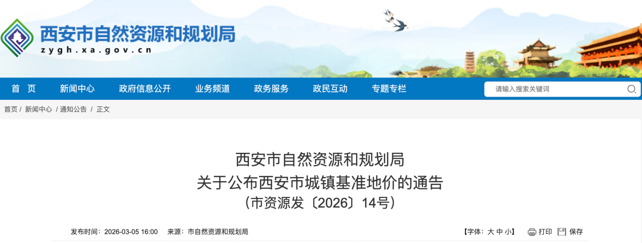 为强化政府对城市地价和土地市场的管理,促进西安市土地市场持续健康发展。3月5日,西安市自然资源和规划局发布《关于公布西安市城镇基准地价的通告》,对西安城镇基准地价进行了更新公布。本基准地价自公布之日起执行。