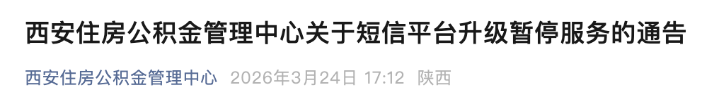 西安住房公积金管理中心短信平台待升级,将暂停服务