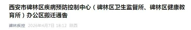 4月7日,西安市碑林区疾病预防控制中心发布公告,该中心(碑林区卫生监督所、碑林区健康教育所)办公区搬迁新址。